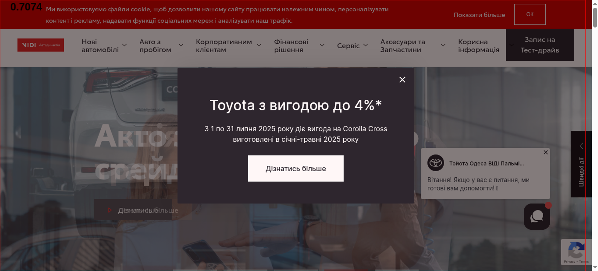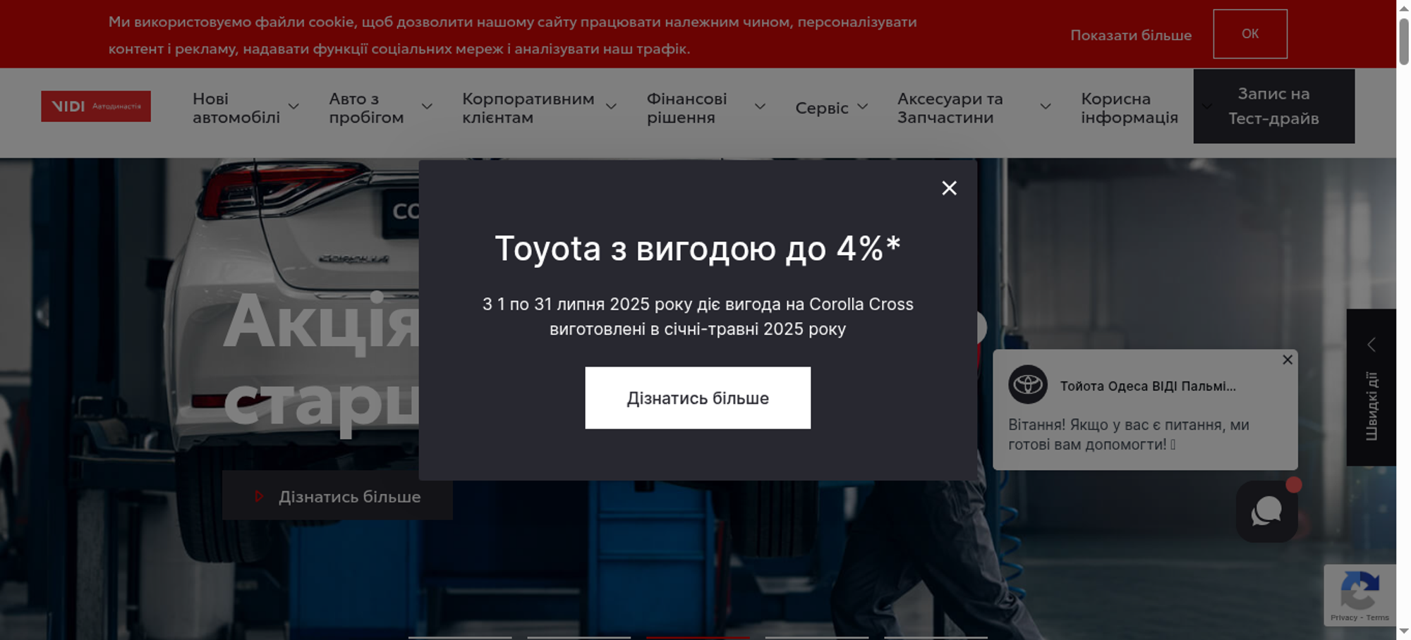 | Offenders: https://toyota-odessa.com.ua/assets/a812a349/css/config.css?v=1596552694 https://toyota-odessa.com.ua/css/index.min.css?v=1753343426 https://toyota-odessa.com.ua/uploads/5/26200-vidi_red_ukr_3.svg https://toyota-odessa.com.ua/icon/icon-steering-wheel.svg https://toyota-odessa.com.ua/icon/icon-engine.svg https://toyota-odessa.com.ua/icon/icon-model.svg https://toyota-odessa.com.ua/icon/icon-file.svg https://www.google.com/recaptcha/api.js?render=6Lf9DLkpAAAAAFKec1Zi4vyO95rh7f1nTFdvaf6B https://toyota-odessa.com.ua/assets/8fa4c072/yii.js?v=1600120330 https://toyota-odessa.com.ua/assets/a812a349/js/config.js?v=1596552694 https://toyota-odessa.com.ua/assets/639e0076/jquery.pjax.js?v=1507803074 https://toyota-odessa.com.ua/assets/8fa4c072/yii.activeForm.js?v=1600120330 https://www.googletagmanager.com/gtag/js?id=G-EB51PW0SZK https://toyota-odessa.com.ua/images-webp/440_200_8b90da4b-90d5-42c4-8dbb-d020bacab3af.webp https://toyota-odessa.com.ua/images-webp/440_200_23417e0d-5542-4d52-b0d7-5cf16e3ace06.webp https://toyota-odessa.com.ua/images-webp/440_200_3ecccad7-56c6-4600-8874-f6c174743941.webp https://toyota-odessa.com.ua/images-webp/440_200_269238e4-4a7c-45fd-a20c-36bf7e1aa3c8.webp https://toyota-odessa.com.ua/images-webp/440_200_beafaaab-b959-4e53-a77c-f616d15c9cee.webp https://toyota-odessa.com.ua/images-webp/440_200_8d332c30-bd35-4bb5-a325-c5a39a220337.webp https://toyota-odessa.com.ua/images-webp/440_200_e3627276-4db3-42f3-afa4-83b2551025d0.webp https://toyota-odessa.com.ua/images-webp/440_200_5028e61e-73a8-446e-b19e-1fa929399003.webp https://toyota-odessa.com.ua/images-webp/440_200_32e8bab1-c804-45e5-8192-b4039b4daff0.webp https://toyota-odessa.com.ua/images-webp/440_200_4bb0ac0c-ea60-463b-81a3-7614d2369bb8.webp https://toyota-odessa.com.ua/images-webp/440_200_ea8cbd10-d33b-42a8-b10b-2113f4c169e7.webp https://toyota-odessa.com.ua/images-webp/440_200_6ad2a083-6c7a-43ed-9630-77a9223f99b1.webp https://toyota-odessa.com.ua/images-webp/440_200_31f1d60a-015c-4a2b-972f-8a5341b54304.webp https://toyota-odessa.com.ua/images-webp/440_200_8c0d58c4-d229-4c7c-8c48-cbdfd63a99b8.webp https://toyota-odessa.com.ua/images-webp/440_200_5983f9f3-cb13-4837-bda1-c836bc8d5d6b.webp https://toyota-odessa.com.ua/uploads/thumb/37566-1-v_naavnosti_3.webp https://toyota-odessa.com.ua/uploads/thumb/36737-1-v_naavnosti_2.webp https://toyota-odessa.com.ua/uploads/thumb/37740-1-v_naavnosti_4.webp https://toyota-odessa.com.ua/uploads/thumb/31484-1-camry_sira_2.webp https://toyota-odessa.com.ua/uploads/thumb/37757-1-v_naavnosti_5.webp https://toyota-odessa.com.ua/uploads/thumb/36918-1-rav4_v_naavnosti_1.webp https://toyota-odessa.com.ua/svg/header_logo.svg https://toyota-odessa.com.ua/js/index.min.js?v=1747145045 https://toyota-odessa.com.ua/uploads/5/28459-spetsialna_sina.jpg https://toyota-odessa.com.ua/uploads/5/28850-novyna_camry.jpg https://toyota-odessa.com.ua/uploads/7/36728-intro1_1.jpg https://toyota-odessa.com.ua/uploads/7/35218-trejdin.jpg https://toyota-odessa.com.ua/uploads/5/28851-zapys_na_servis_toyota_online.jpg https://toyota-odessa.com.ua/svg/arrow_right.svg https://www.googletagmanager.com/gtm.js?id=GTM-TQJF8HR3 https://toyota-odessa.com.ua/fonts/toyota_rg.woff2 https://toyota-odessa.com.ua/fonts/toyota_bd.woff2 https://toyota-odessa.com.ua/img/check.svg https://www.googletagmanager.com/gtag/js...nager.com/gtag/js https://www.youtube.com/iframe_api https://toyota-odessa.com.ua/svg/pin.svg https://www.facebook.com/privacy_sandbox/topics/registration/?id=182457287985309 https://www.facebook.com/privacy_sandbox/pixel/register/trigger/...register/trigger/ https://vidipalmira.helpcrunch.com/api/v2/applications/766332c1-6a66-4ba6-9086-7f39fa4a6a3a |